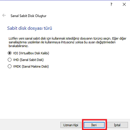 • Daha sonra sabit disk dosya türünü ‘VDI (VirtualBox Disk Kalıbı)’ seçelim ve ‘İleri’ butonu ile devam edelim.