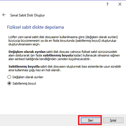 • Bir sonraki adımda disk boyutu durumu ekrana geliyor. Değişken olarak ayrılan boyutu da seçebilirsiniz, fakat bizim tavsiyemız ‘Sabitlenmiş boyut’ seçilerek devam edilmesidir.