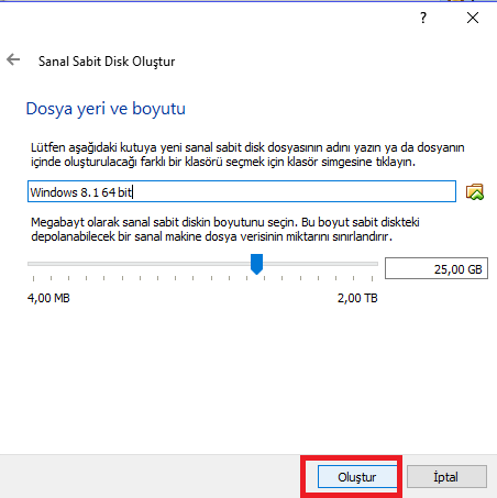 • Bir sonraki adımda ise sabit disk boyutunu belirtiyoruz. Kayıt yeri ise varsayılan olarak belirlenmiş durumda; herhangi bir değişiklik yapmamız gerekli değildir.