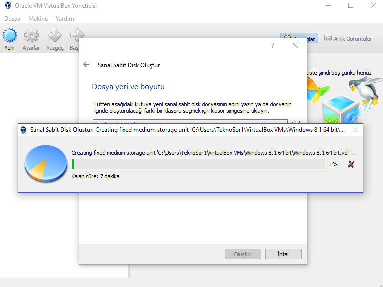 • Bir sonraki adımda ise aşağıda görüldüğü gibi yaptığımız ayarlara göre sanal makine oluşturma süreci başladı. Henüz ortada işletim sistemi yok. Sadece donanımlar ayarlanıyor. Yüzde dolana kadar beklemede kalalım.