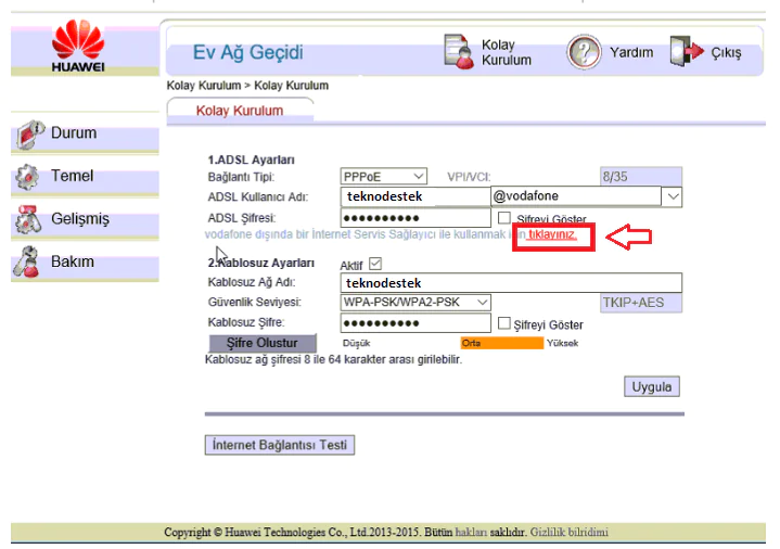 Gelen ekranda “Kolay Kurulumu” tıklayınız. Hiçbir işlem yapmadan “vodafone dışında bir İnternet Servis Sağlayıcısı ile kullanmak için ‘tıklayınız’ ” yazan kısma tıklayınız. Yeni pencere açılacaktır.