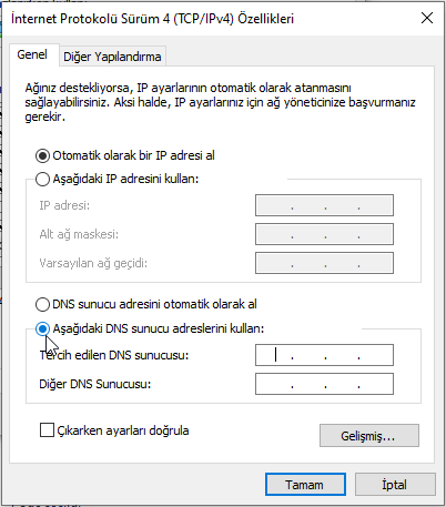 • Aşağıdaki DNS sunucu adreslerini kullan‘ı seçin.
