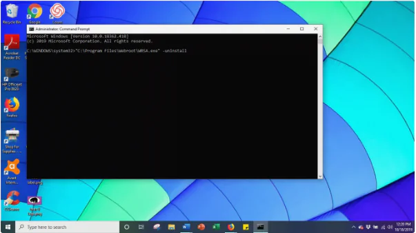 3.Komut istemi penceresine aşağıdaki komutu yazın ve enter tuşuna basın: “C: Program Files Webroot WRSA.exe “–uninstall”