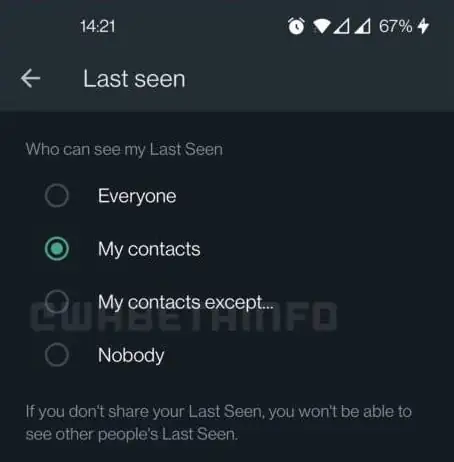 “Son Görülme” seçeneğini seçtiğinizde, son görülme durumlarını da göremeyeceğinizi belirtmekte fayda var. Bu “özel kural” Hakkında ve Profil Fotoğrafı ayarlarına uygulanmıyor gibi görünüyor, bu nedenle sizi kendi “hariç” listelerine eklemedilerse, onlarınkini yine de görebileceksiniz. Ayrıca “kara listeye” eklediğiniz kişide bu özellik etkin olmasa bile yine de bilgilerinizi göremezler.