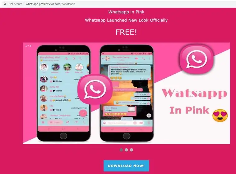 Sadece birkaç gün önce, bir WhatsApp, mesajlaşma uygulamasında kullanıcılardan uygulamanın pembe bir sürümünü indirmelerini istedi. Mesaj bir bağlantı içeriyor ve WhatsApp’ın yeni özelliklerle yeni bir sürümünü kullanabileceğinizi gösteriyor. Uygulamanın adı, kötü amaçlı bir uygulama olduğu ortaya çıkan “WhatsApp Pink”. Uygulamanın rengini değiştiriyor gibi görünüyor.
