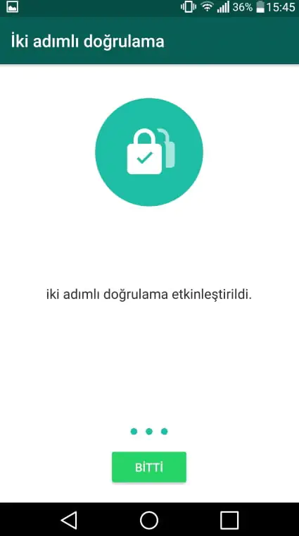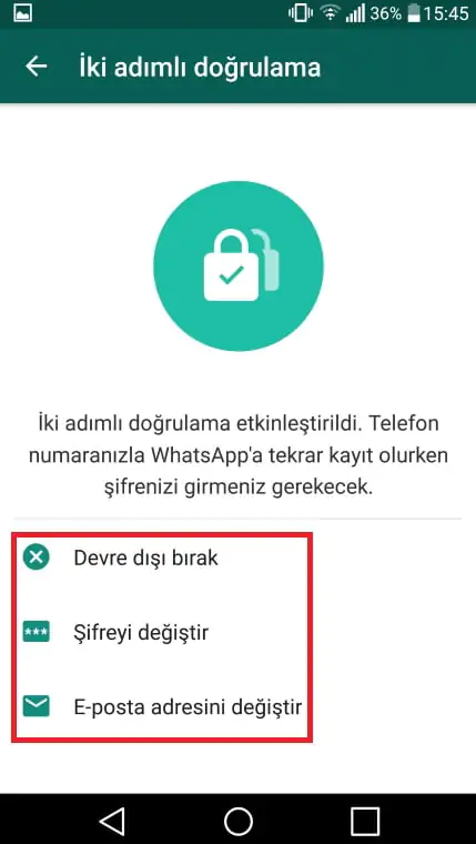 - Gerekli adımları tamamlamamızın ardından ‘İki adım doğrulama’ etkin konuma geçecektir. İlerleyen zamanlarda ‘İki adımlı doğrulamayı’ iptal etmek veya doğrulama bilgilerini değiştirmek istersek, yine Hesap menüsünün altında bulunan ‘İki adımlı doğrulama’ ekranlarından bu işlemi sağlayabiliyoruz.