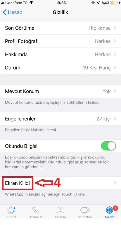 - Daha sonra ise Gizlilik bölümünde bulunan Ekran Kilidi ayarını seçiyoruz ve Touch ID kısmını aktif hale getiriyoruz.