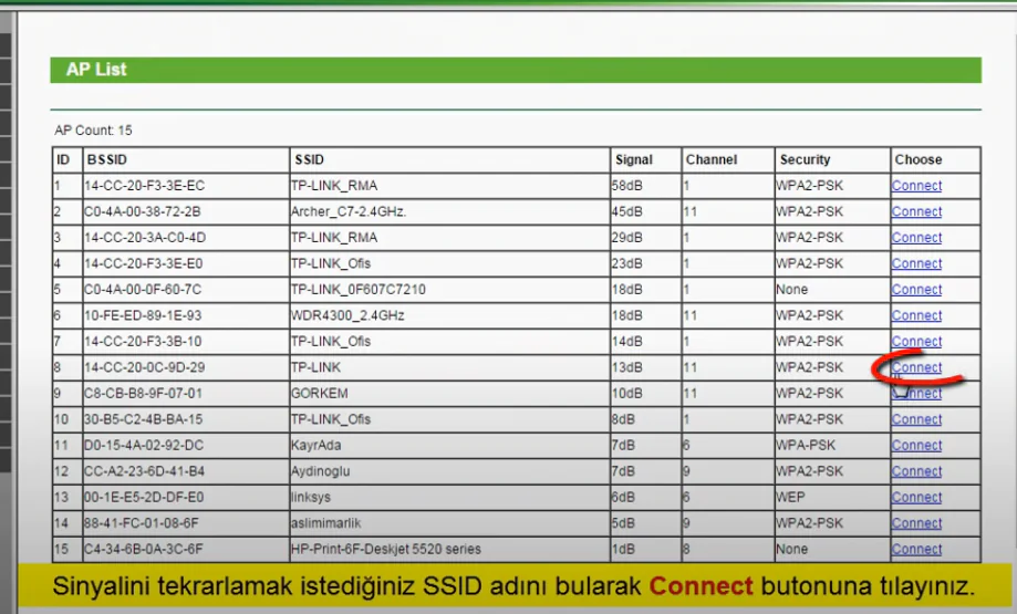 bir sonraki sayfadan secenekler arasından repeater modunu seçip tekrardan next tıklayalım gelen sayfadan survey seceneğine tıklayalım ve çıkan ağlardan kendi ağımızı bulup sağındaki connect butonuna tıklayalım