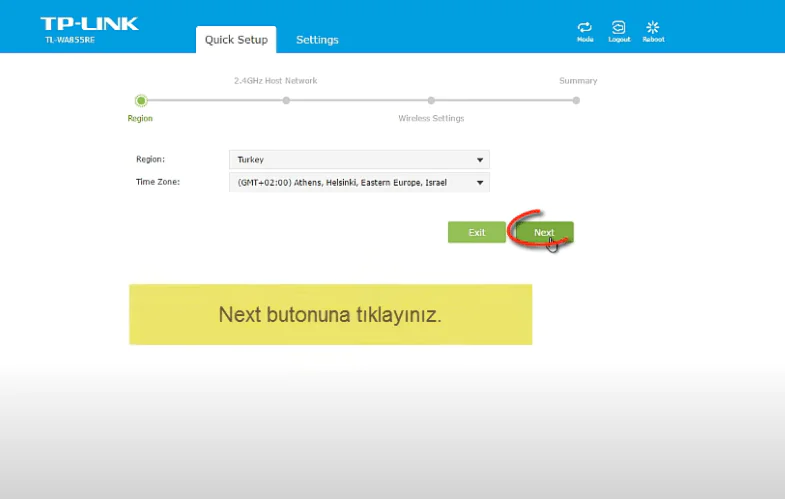 Öncelikle genişleticimizi bilgisayar lan kablosu ile bağlantısını gerçeklşetirerek boş bir internet sayfası acalım ve tarayıcı cubuğuna gelerek su ıp adresini 192.168.0.254 veya tplinkrepeater.net yazıp aratalım gelen kullanıcı adı ve parola kısımlarına kucuk harfler ile admin yazarak login butonuna tıklayalım direk karşınıza arayüz sayfasının parolasını değiştirmek için bir sayfa gelicek burda isters değişklik yapabilirsiniz isterseniz kapatarak geçebilirsiniz şimdi ise karşınıza quick setup kolay kurulum bolümü gelicek burdan region turkey olarak secelim time zone ise gmt+02:00 secip ileri butonuna tıklayalım simdi wifi ağlarını tarıyacak buranın dolmasını bekliyoruz daha sonra ise ana modeminiz ismine tıklıyoruz ve acılan parola kısmına wifi ağ şifresini yazıyoruz daha sonrasında tekrar next butonuna tıklayın diğer gelen sayfada ise genişleticin wifi ağ adını değiştirebilirsiniz isterseniz sabitte bırakıp next butonuna tıklaıyn