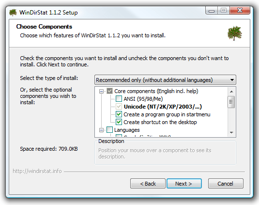 WinDirStat’ı kurmak o kadar kolaydır ki, dikkat edilmesi gereken şey, eski sistemlerde çalışırken ANSI’yi çekirdek bir bileşen olarak kontrol ettiğinizden emin olmaktır.