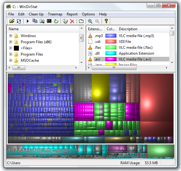 WinDirStat, Dizin Listesi, Eklenti Listesi ve grafiksel olarak çılgın renkli Treemap’in üç bölümünü içerir. Uzantı listesindeki renkler, Treemap’teki dosya türünün konumuna karşılık gelir.