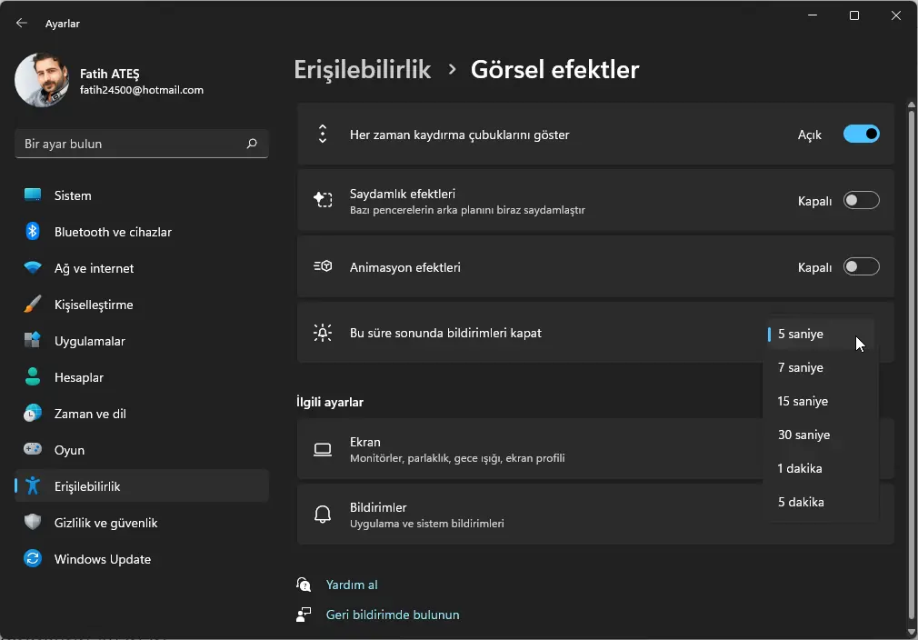 - Bu süre sonunda bildirimleri kapat seçeneğini 5, 7, 15, 30 saniye veya 1, 5 dakika olarak isteğinize uygun olarak değiştirin.
