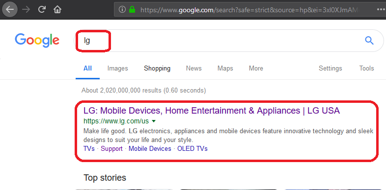 - Öncelikle bilgisayarımızdan bir tarayıcı (Microsoft Edge, Google Chrome, Mozilla Firefox, Opera, vs) açalım ve Google arama motoru kutucuğuna LG yazıp aratalım ve çıkan arama sonuçlarında, en üst kısımda yer alan lg.com sayfasına giriş yapalım.