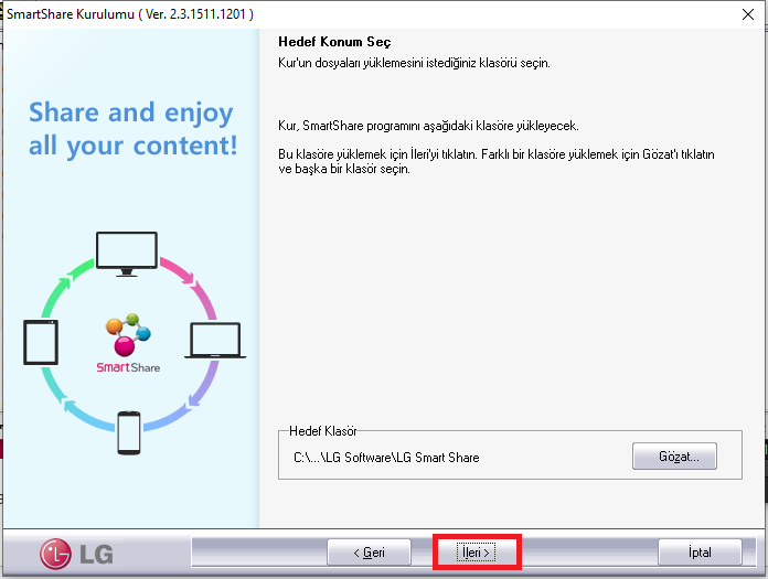 - Kurulumun yapılacağı varsayılan hedef konumu onaylamak ve kuruluma devam etmek için ‘İleri’ butonuna tıklıyoruz.