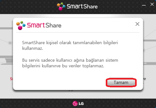 - SmartShare programını başlatıyoruz. İlk açılışta gelen bilgilendirme penceresinde ‘Tamam’ butonuna tıklıyoruz.