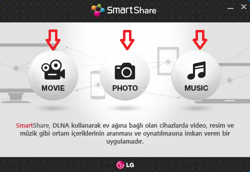 - LG webOS Smart TV’nize aktarmak istediğiniz dosya türünü (MOVIE, PHOTO, MUSIC) seçebilirsiniz. Biz, bu makaledeki örnek gösterim amacıyla LG webOS Smart TV’ye video aktarmak için MOVIE seçeneğini seçiyoruz.
