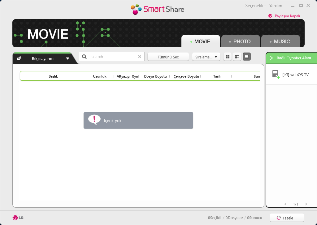 - Uygulama, (yerel) ağ üzerinden [LG] webOS TV’yi buluyor. Bilgisayarımızda yayınlayacak bir içerik bulunmadığından ‘İçerik yok.’ uyarı ve bilgilendirme mesajını gösteriyor.