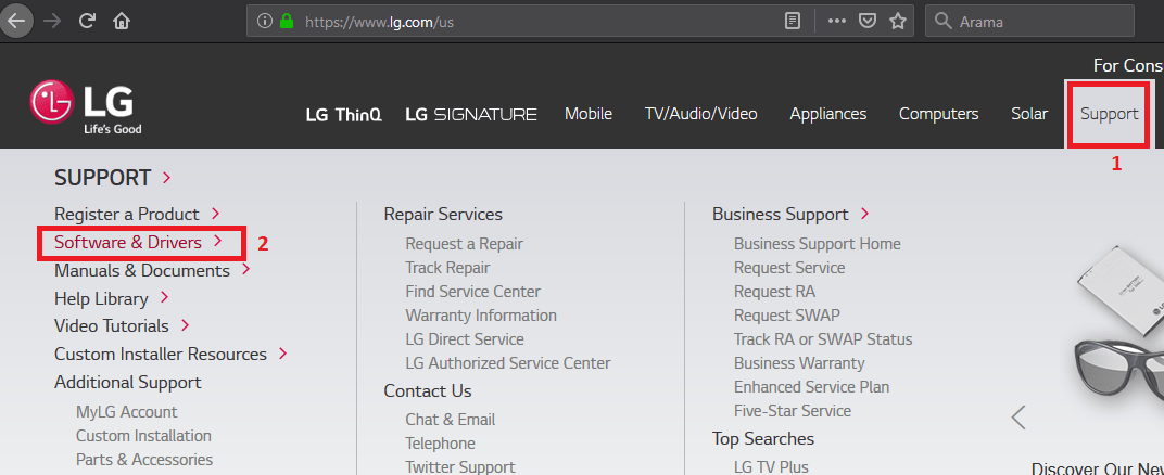- Açılan lg.com sayfasında üst kısımdaki menü listesinden ‘Support (Destek)’ menüsüne tıklayalım ve açılan alt menü penceresinden ‘Software & Drivers (Yazılım ve Sürücüler)’ menüsüne tıklayalım.