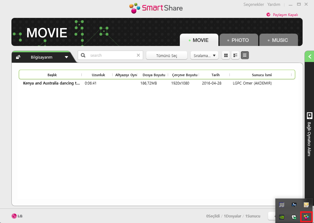 - LG SmartShare uygulamasının ayarlarını düzenlemek için, ekranın sağ alt köşesinde, saat ve tarihin olduğu kısımdaki SmartShare uygulama simgesine sağ tıklıyoruz.