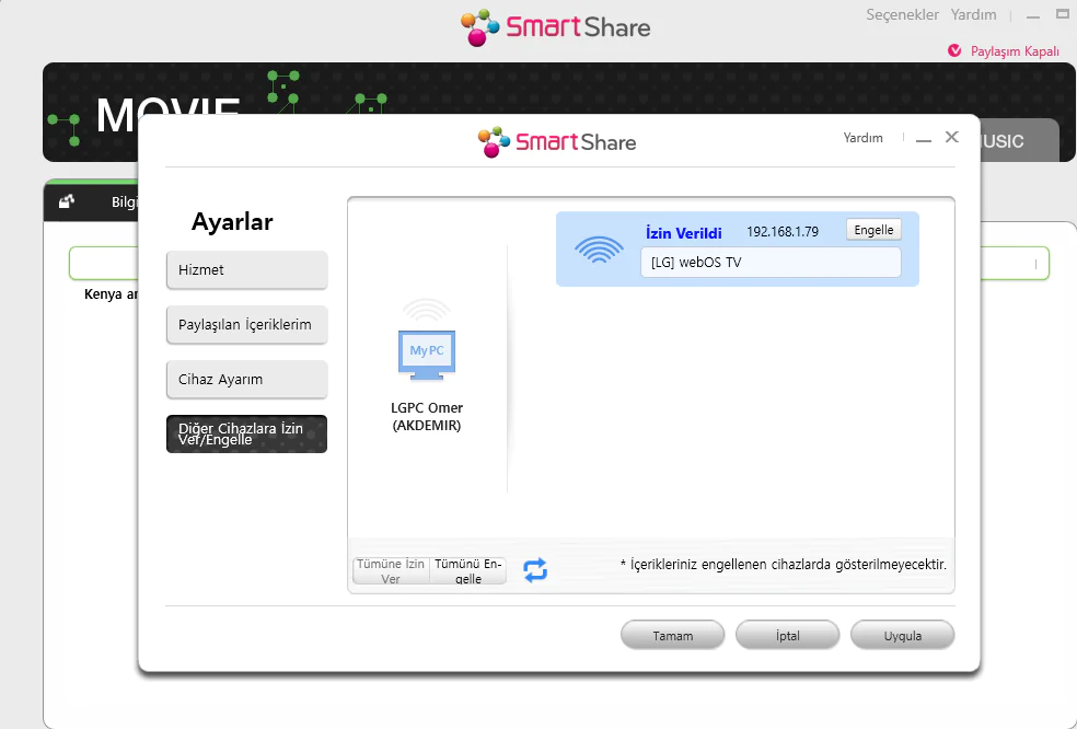 LG SmartShare özelliğini kullanabilmek için, hem LG webOS Smart TV’nizin hem de Windows 10 bilgisayarınızın kablolu veya kablosuz olarak aynı modeme (yerel ağa) bağlı olması gerekiyor.