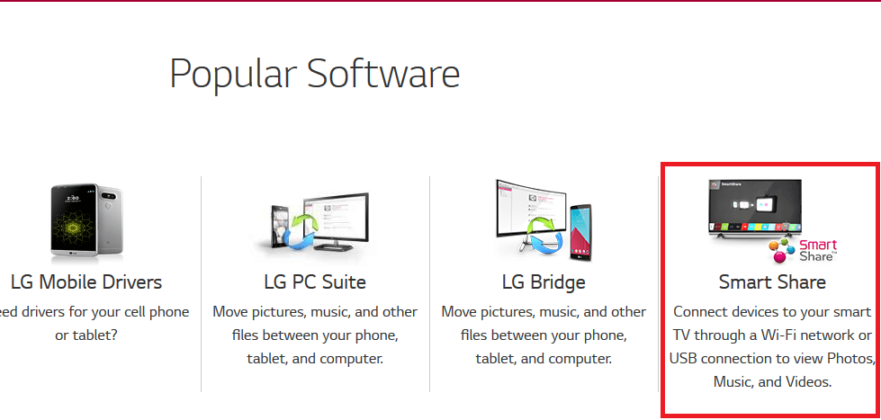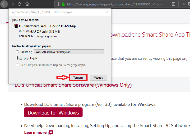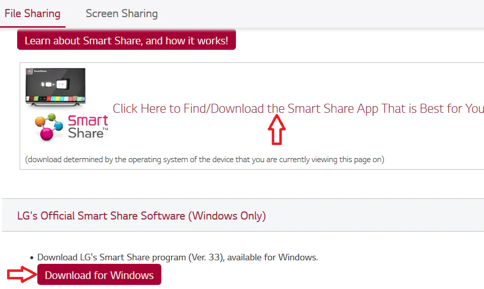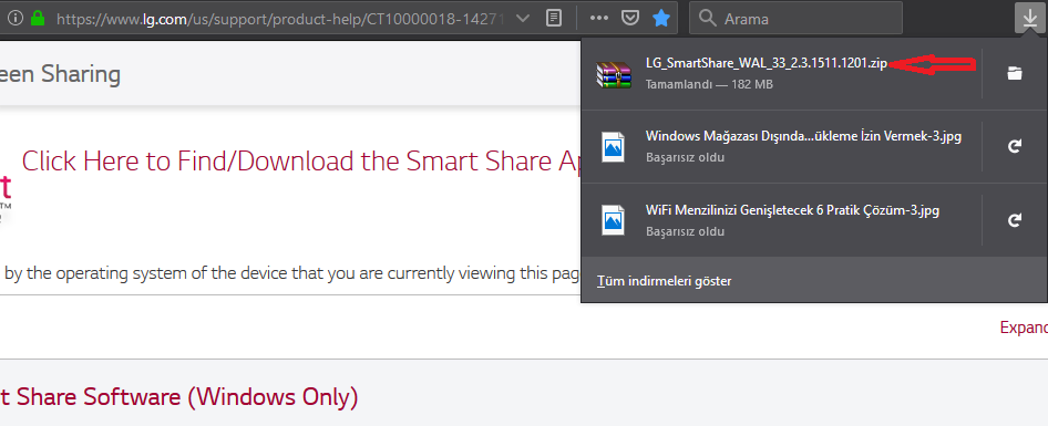 - Açılan sayfada Windows (10) için LG SmartShare yazılımını indirmek amacıyla, aşağıdaki ekran görüntüsünde ok işareti gösterilen linke ve butona tıklıyoruz.