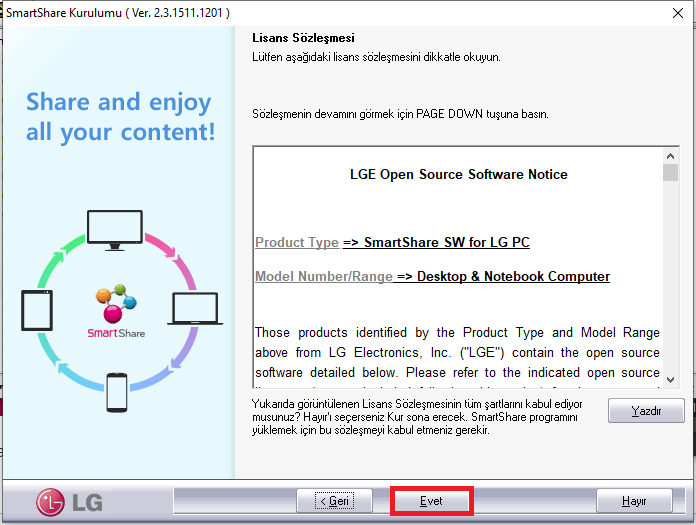 - Lisans Sözleşmesi’ni onaylamak ve kuruluma devam etmek için ‘Evet’ butonuna tıklıyoruz.