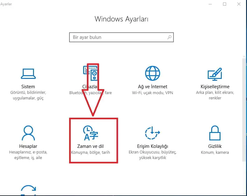 - İşlemlerimizin devamında karşımıza gelecek olan ekranda, ‘Zaman ve dil’ menüsüne tıklayıp işlemlerimize devam ediyoruz.