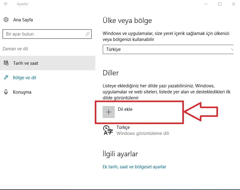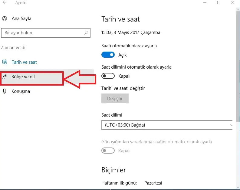 - Açılan ekranın sol tarafında yer almakta olan ‘Bölge ve dil’ seçeneğine tıklıyoruz,
