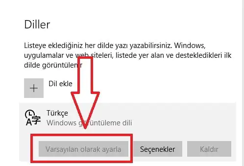 - Dil paketi indirme ve kurulum işlemi bittikten sonra, bu dil paketini seçip, alt kısımdaki seçenekler içerisinde ‘Varsayılan Olarak Ayarla’ seçeneğini tıklamanız halinde, Windows sistem dili, istediğiniz dil olarak ayarlanacaktır.