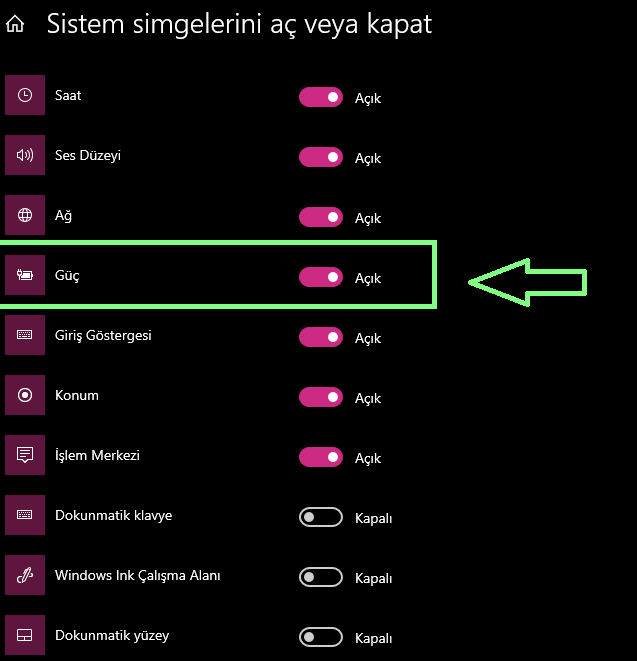 Sizlerde Windows 10 bilgisayarlarınızda pil ( güç) simgesi ayarlarını tamamlayın.