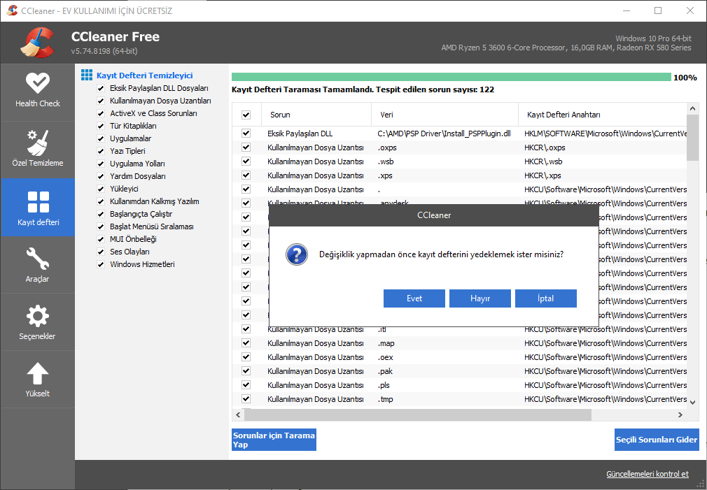 Tüm kayıt defteri onay kutularını seçin ve Sorunlar için Tarama Yap butonuna basın.