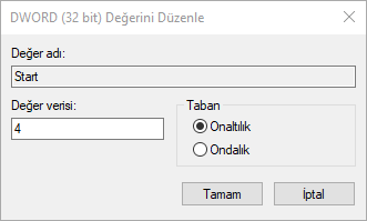 Değer verisi kutusundaki mevcut değeri silin ve ardından değiştirme değeri olarak “4” girin. Tamam butonuna tıklayın.