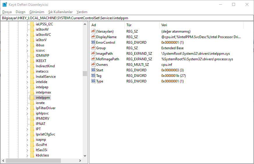 HKEY_LOCAL_MACHINESYSTEMCurrentControlSetServicesIntelppm