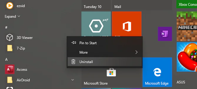 Yazılımı Başlat menüsünde bulun, sağ tıklayın ve “Kaldır’ı” seçin.