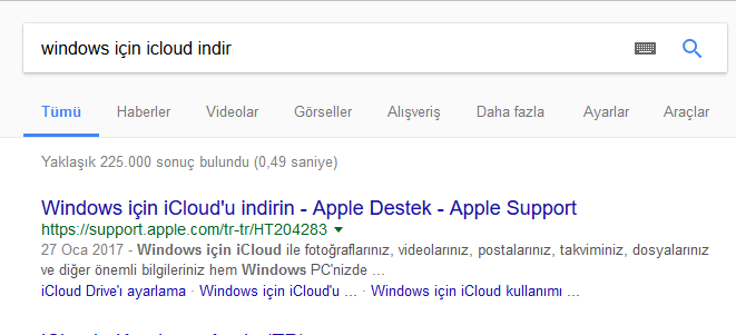 • Öncelikle Google açarak “windows için icloud indir” yazıyoruz ve ilk çıkan arama sonucuna tıklıyoruz.
