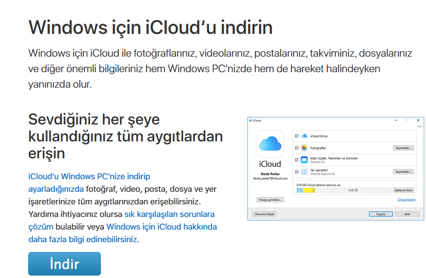Açılan yeni pencerede İndir butonuna tıklayarak bilgisayarımıza iCloud‘u indiriyoruz.