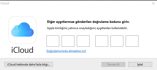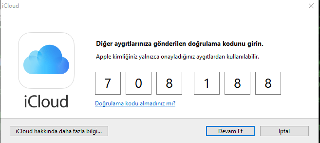 Bu işlemi sağladıktan sonra Apple kimliğini kullandığınız cihazlara onaylama kodu geliyor; bu onaylama kodu sayesinde başka kişiler iCloud hesabınızı kullanamaz; güvenlik açısından önemli bir nokta. Kullandığımız cihaza gelen kodu giriyoruz.