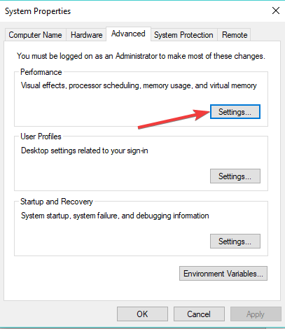 - Şimdi Gelişmiş sekmesine gidin> Performans> Ayarlar’a gidin.