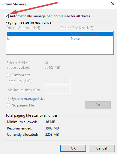 - ‘Tüm sürücüler için disk belleği dosyası boyutunu otomatik olarak yönet’ seçeneğinin işaretini kaldırın