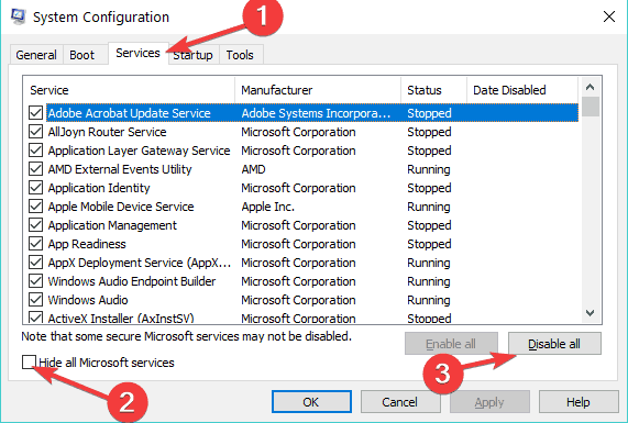 - Sistem Yapılandırması’na gidin> Hizmetler sekmesine tıklayın> Tüm Microsoft hizmetlerini gizle onay kutusunu işaretleyin> Tümünü devre dışı bırak’a tıklayın.