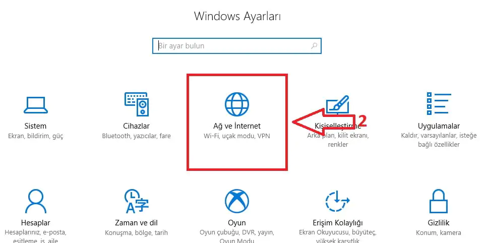 - Daha sonra açılan ‘Windows Ayarları’ menüsünden ‘Ağ ve İnternet’ bölümüne giriyoruz.