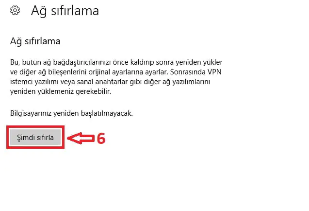 - Son olarak karşımıza gelen ekranda bulunan ‘Şimdi Sıfırla’ butonuna basarak ağ ayarlarını sıfırlama işlemini başlatıyoruz. Tüm işlemler tamamlandıktan sonra bilgisayarımızı bir defa yeniden başlatmamız faydamıza olacaktır.