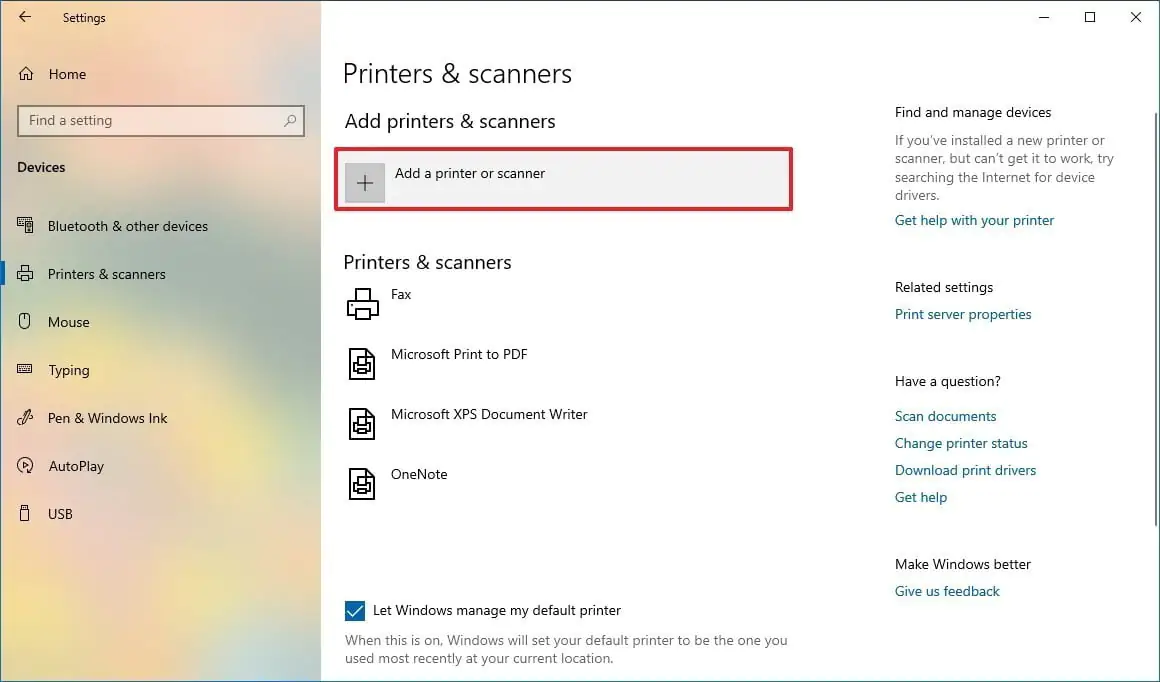 Yazıcılar, donanım ve çevre birimleri kategorisine düşmesine rağmen, Windows 10, yazıcı ve tarayıcı yüklemek için ayrı bir seçenek içerir.