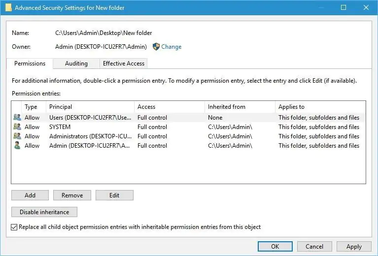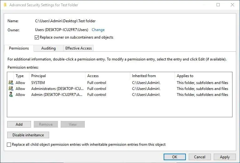 - Bu klasördeki tüm alt klasörlerin sahibini değiştirmek için Alt kaplayıcılardaki ve nesneler deki sahibi değiştir “Replace owner on subcontainers and objects” seçeneğini işaretleyin.