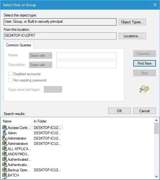 - Şimdi Bul’u tıklatın ve arama sonuçları listesinden kullanıcıyı veya grubu seçin. Tamam’a tıklayınız.