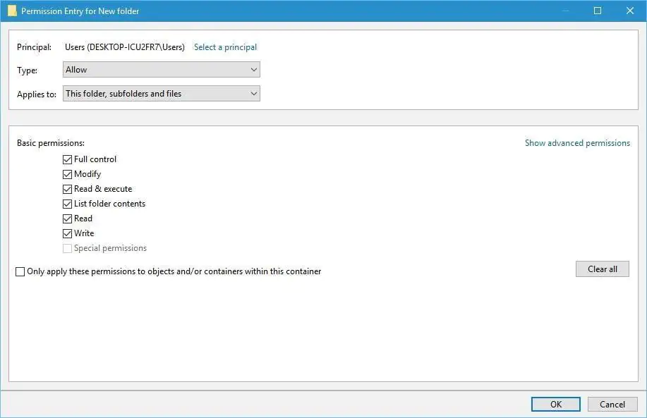 - Klasör, alt klasörler ve dosyalara Set Tipi için izin verin.