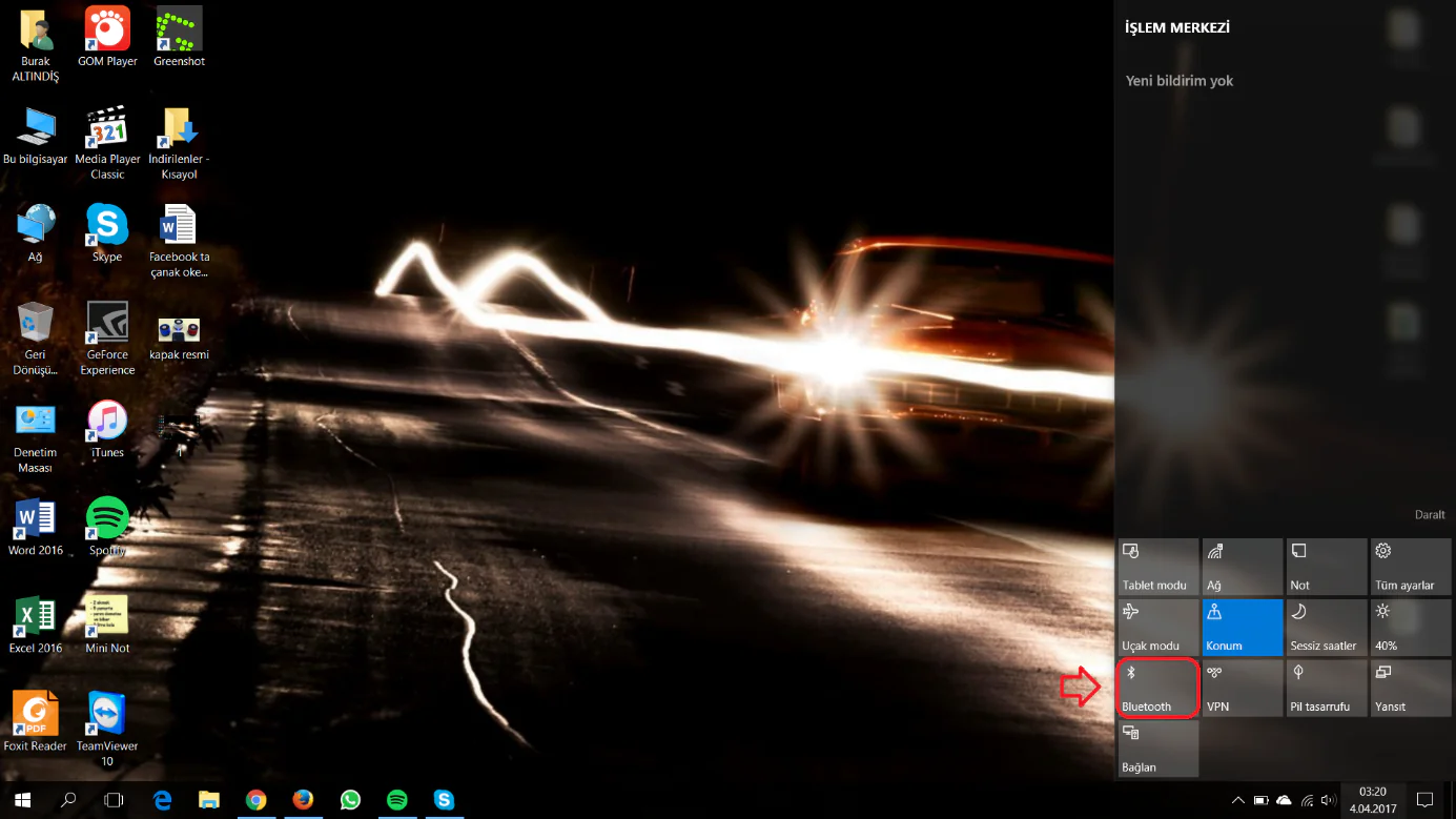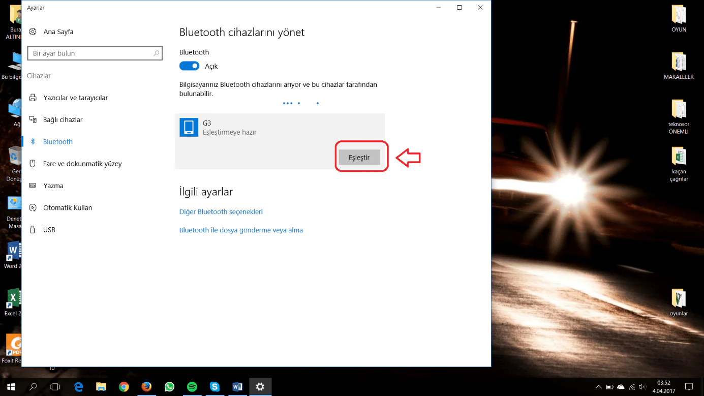 İlk önce cihazı açalım. Daha sonra bilgisayarda Bluetooth ayarlarını açalım. Bu aşamada bilgisayarın Bluetooth özelliğini aktifleştirip, cihaz ile bilgisayarı Bluetooth üzerinden eşleştireceğiz.