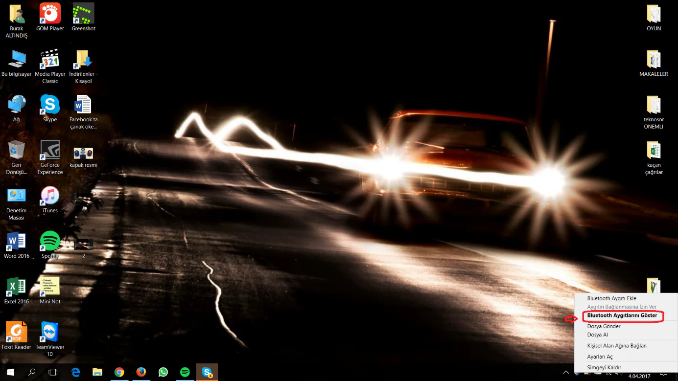 Bluetooth özelliği bilgisayarınızda aktif olduktan sonra, sağ alt köşede Bluetooth simgesi belirecektir; bu simgeye tıklayalım ve açılan menü listesinde “Bluetooth Aygıtlarını Göster” menüsüne tıklayalım.