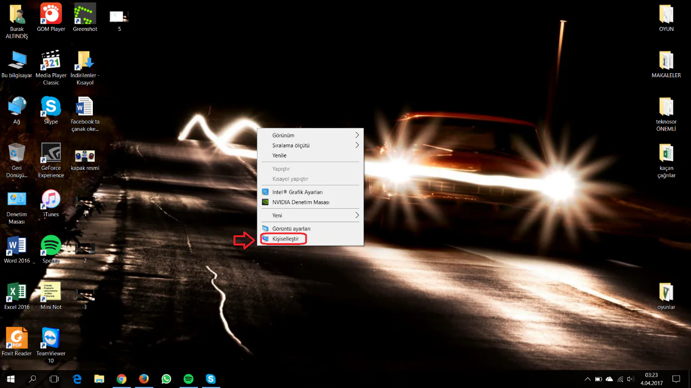 Daha sonra masasüstünde mouse ile sağ tıklayarak açılan menü listesinde “Kişileselleştir” menüsüne tıklayalım.