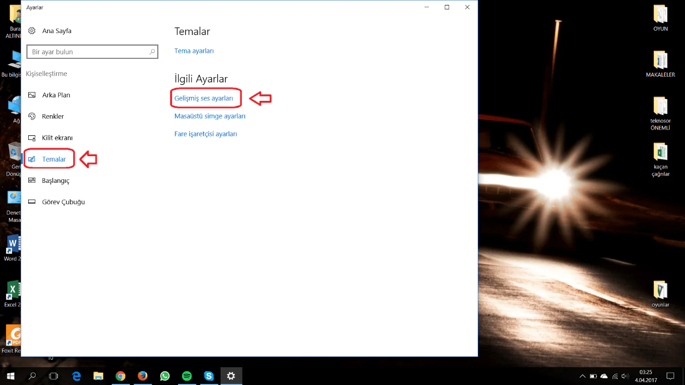 Açılan sayfada sol taraftaki menü listesinden “Temalar” menüsüne tıklayalım ve sonra açılan sayfada “Gelişmiş ses ayarları” menüsüne tıklayalım.